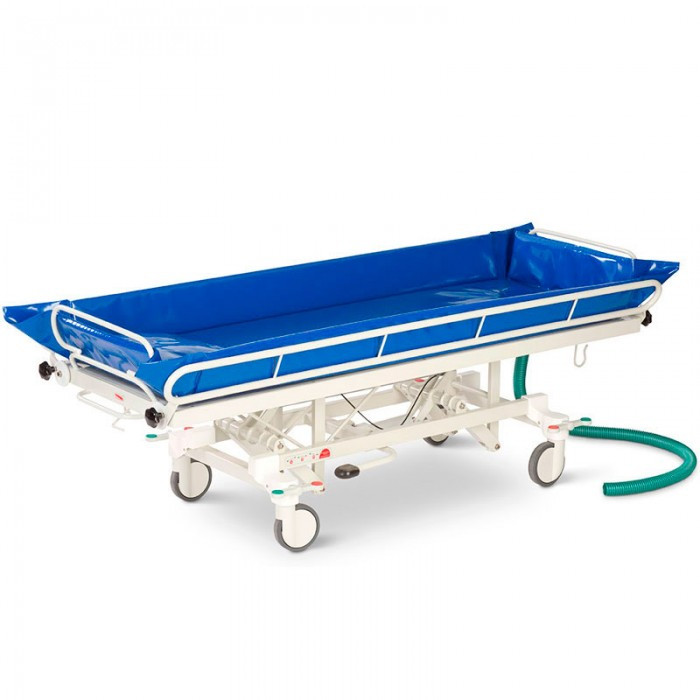 Міцна каталка для душових процедур вирізняється гідравлічним регулюванням висоти ножною педаллю в діапазоні 54-89 см. Каталка обладнана теплоізоляційною оббивкою й подушкою. Бічні огорожі можуть легко регулюватися з обох кінців. Каркас виготовлений із неіржавкої сталі з епоксидним покриттям. Каталка обладнана високоякісними, зносостійкими, водонепроникними роликами з колесами діаметром 150 мм, що блокуються напрямним колесом, що полегшує маневрування в палаті та коридорах. Для зливу води каталка за допомогою пневмопружини нахиляється; каталка забезпечена дренажним шлангом із пристроєм, що запобігає стіканню крапель, і фіксує скобою.